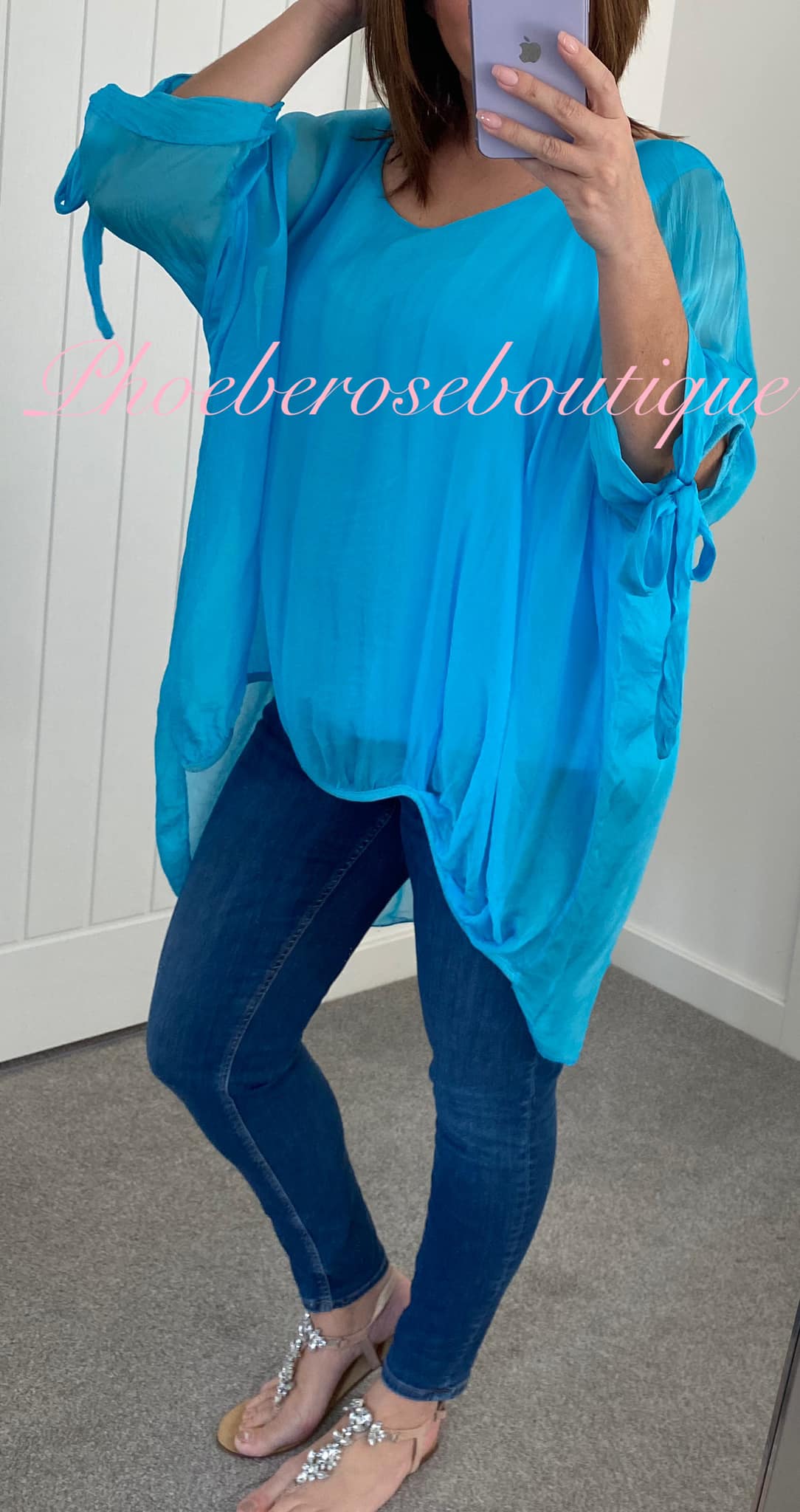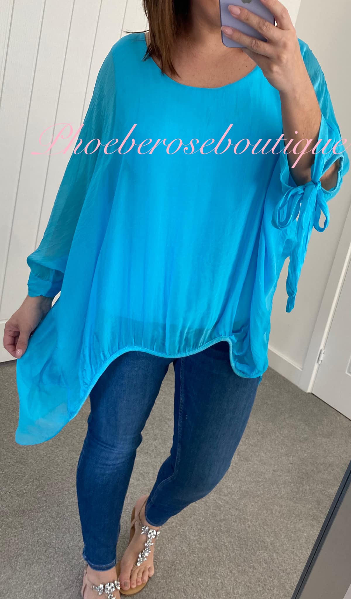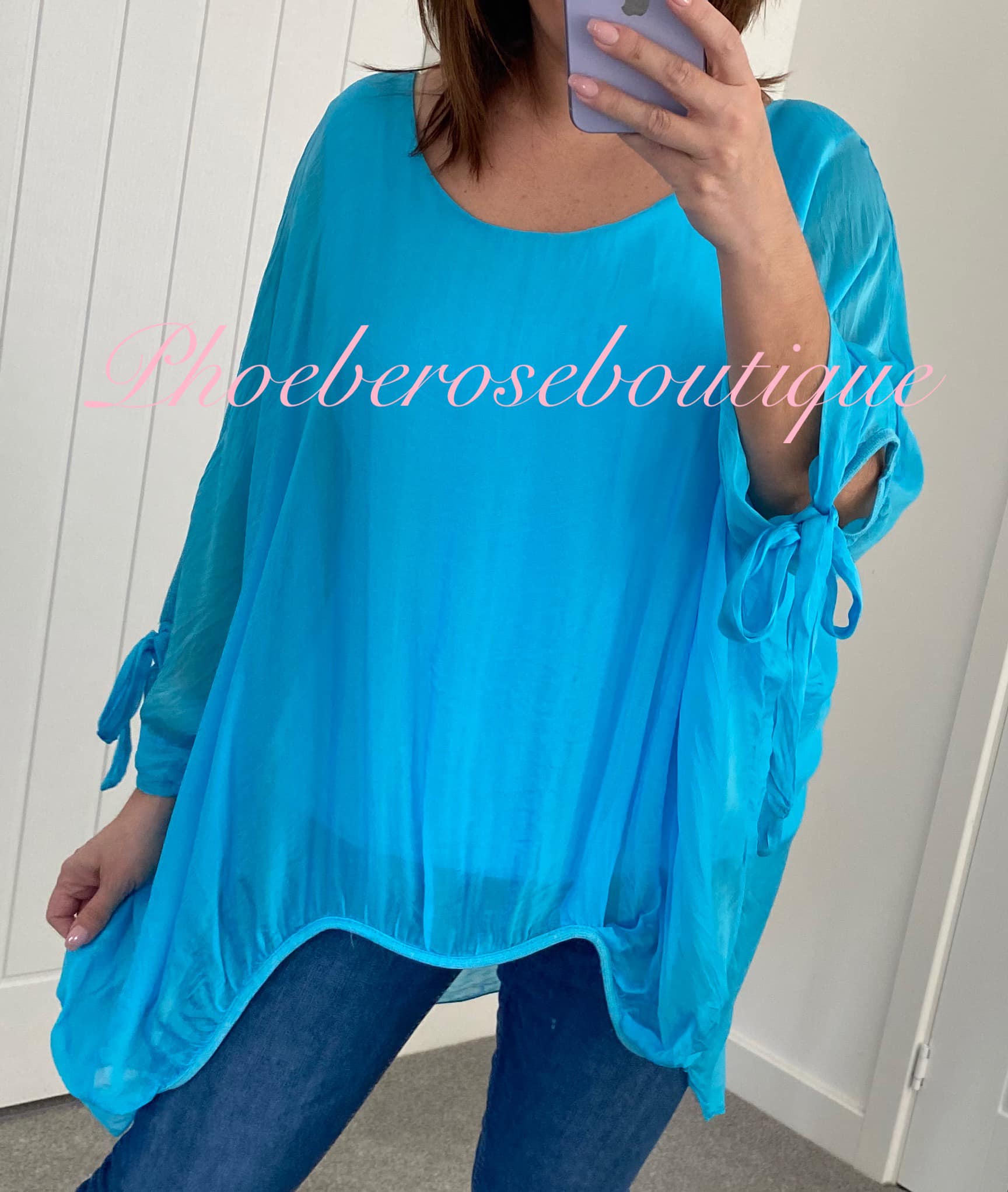 Silk Oversized Hi-Low Tie Sleeve Top – Turquoise
