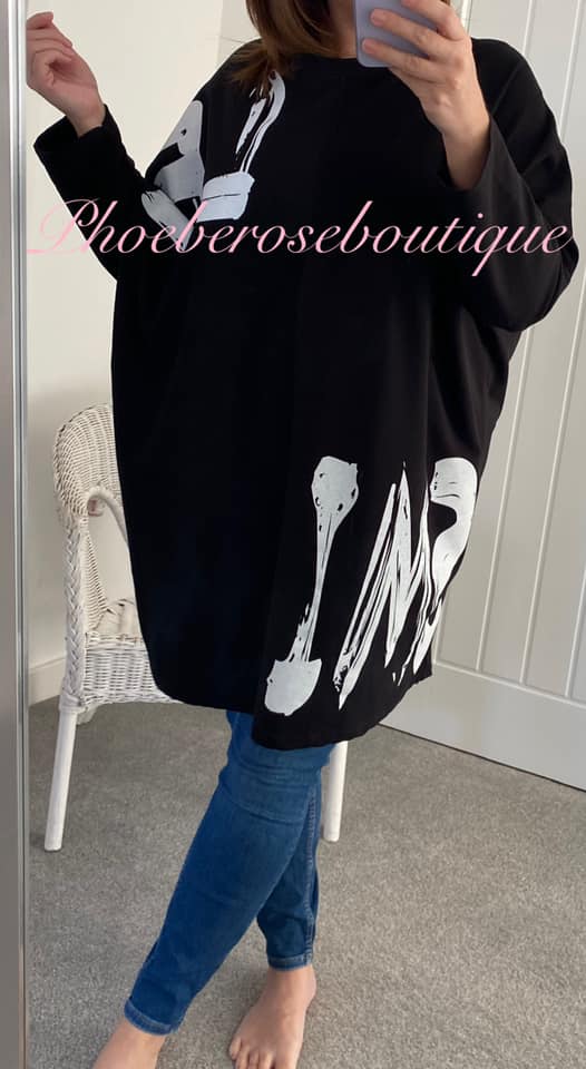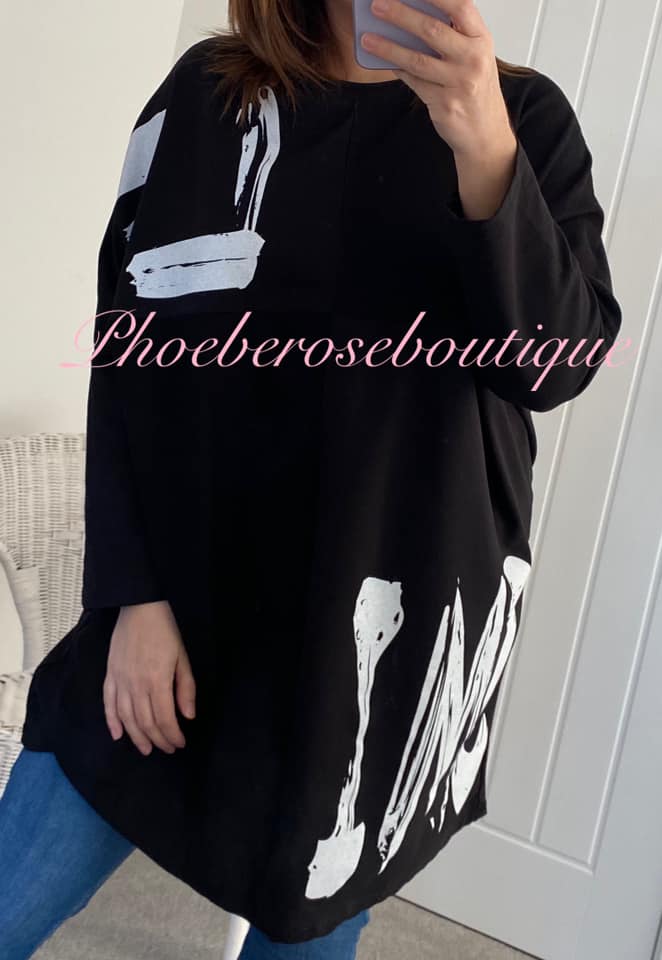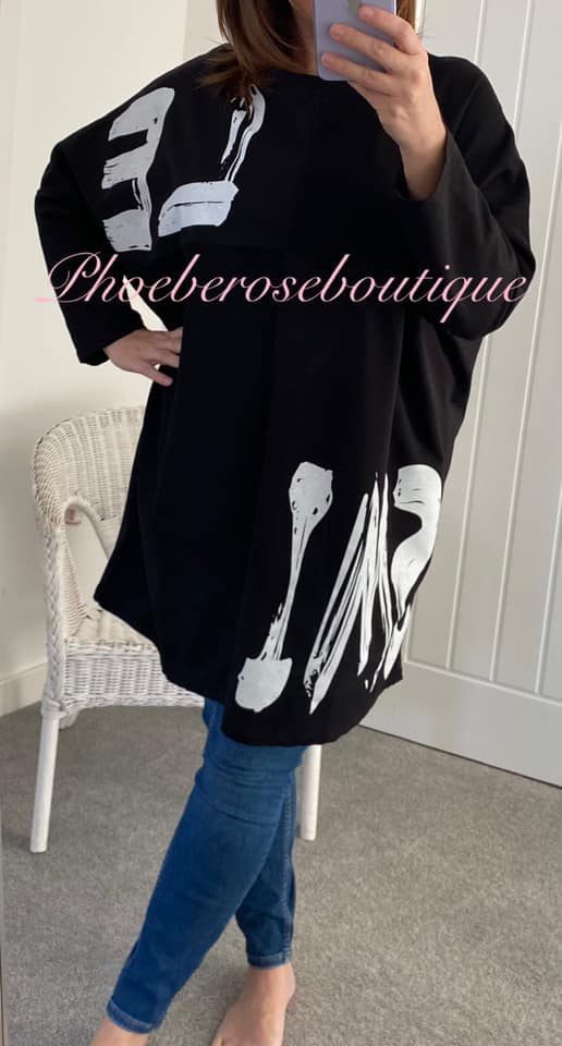 ‘SMILE’ Paint Splash Oversized Sweat Feel Top – Black
