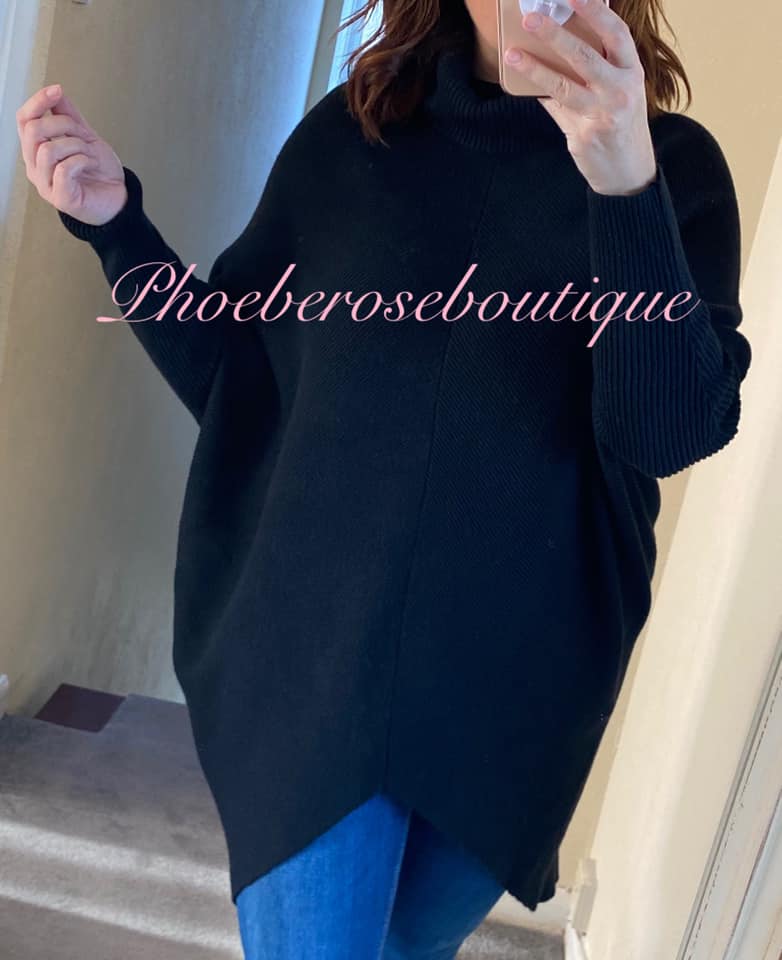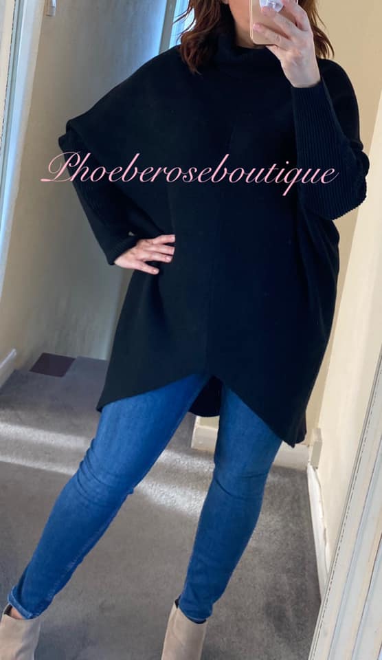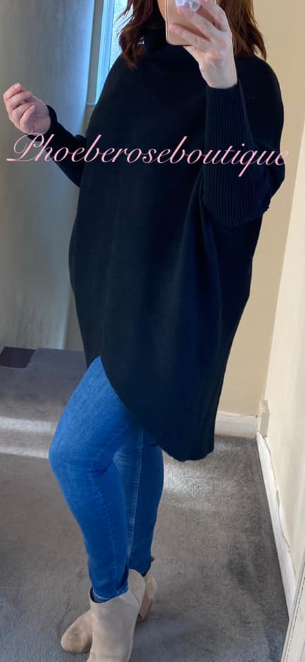 Be the first to review “Soft Ribbed Slouch Roll Neck Hi/Low Jumper – Black”