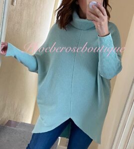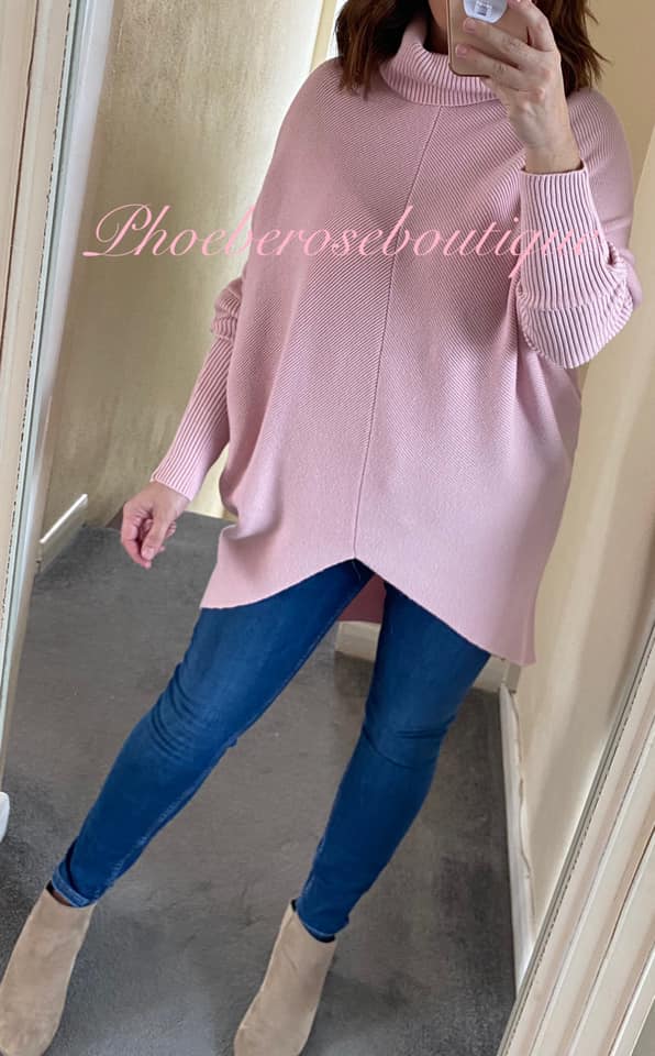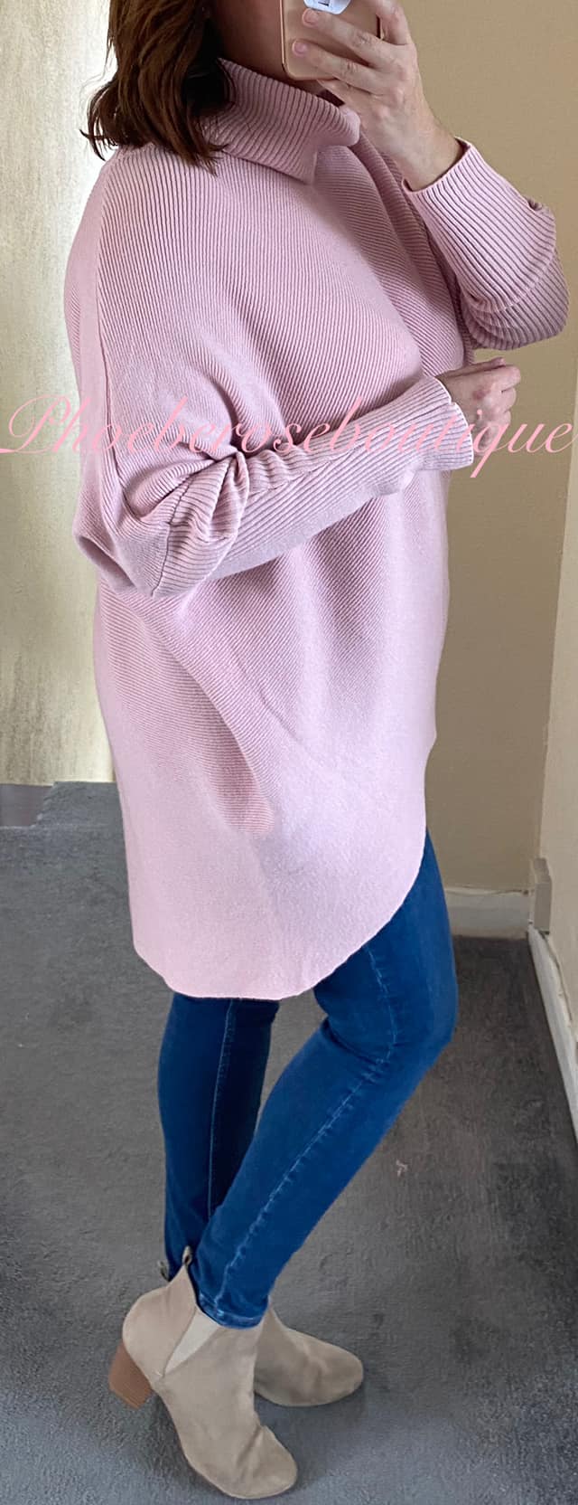 Be the first to review “Soft Ribbed Slouch Roll Neck Hi/Low Jumper – Soft Pink”