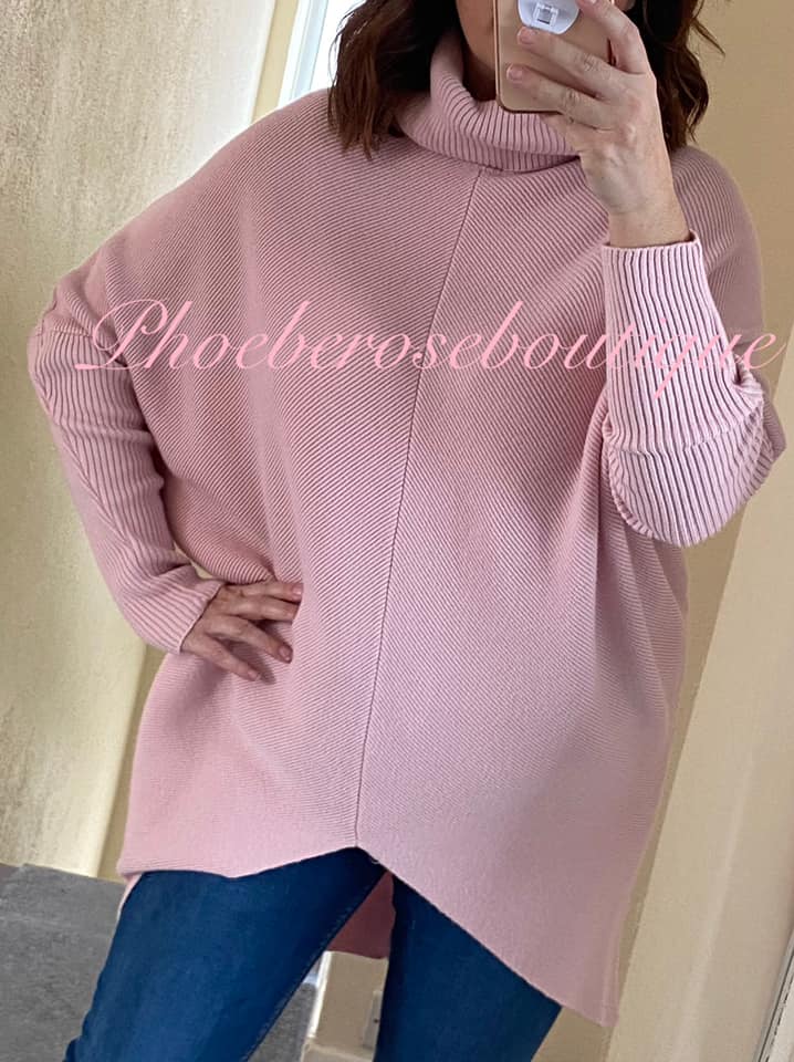 Soft Ribbed Slouch Roll Neck Hi/Low Jumper – Soft Pink