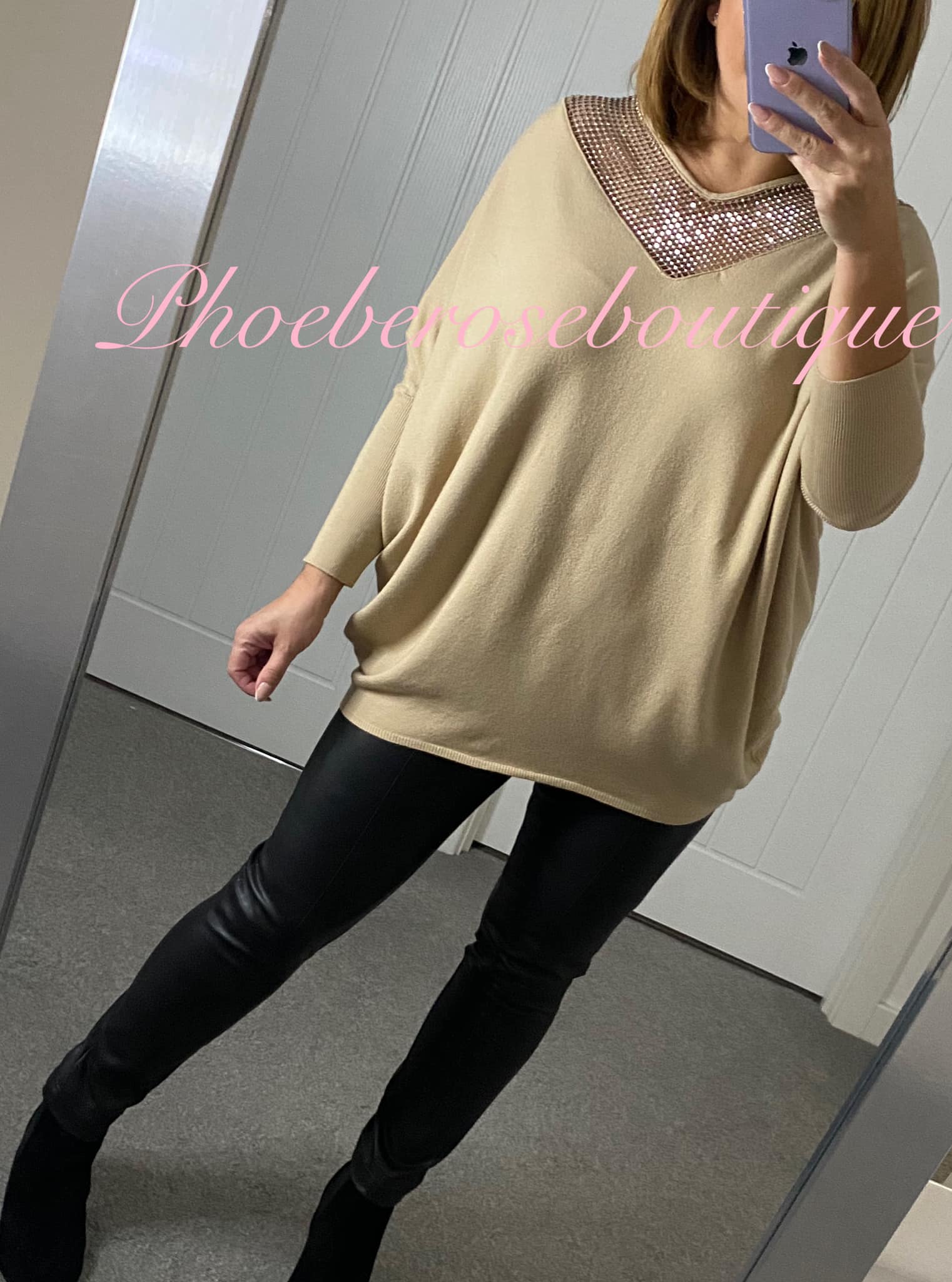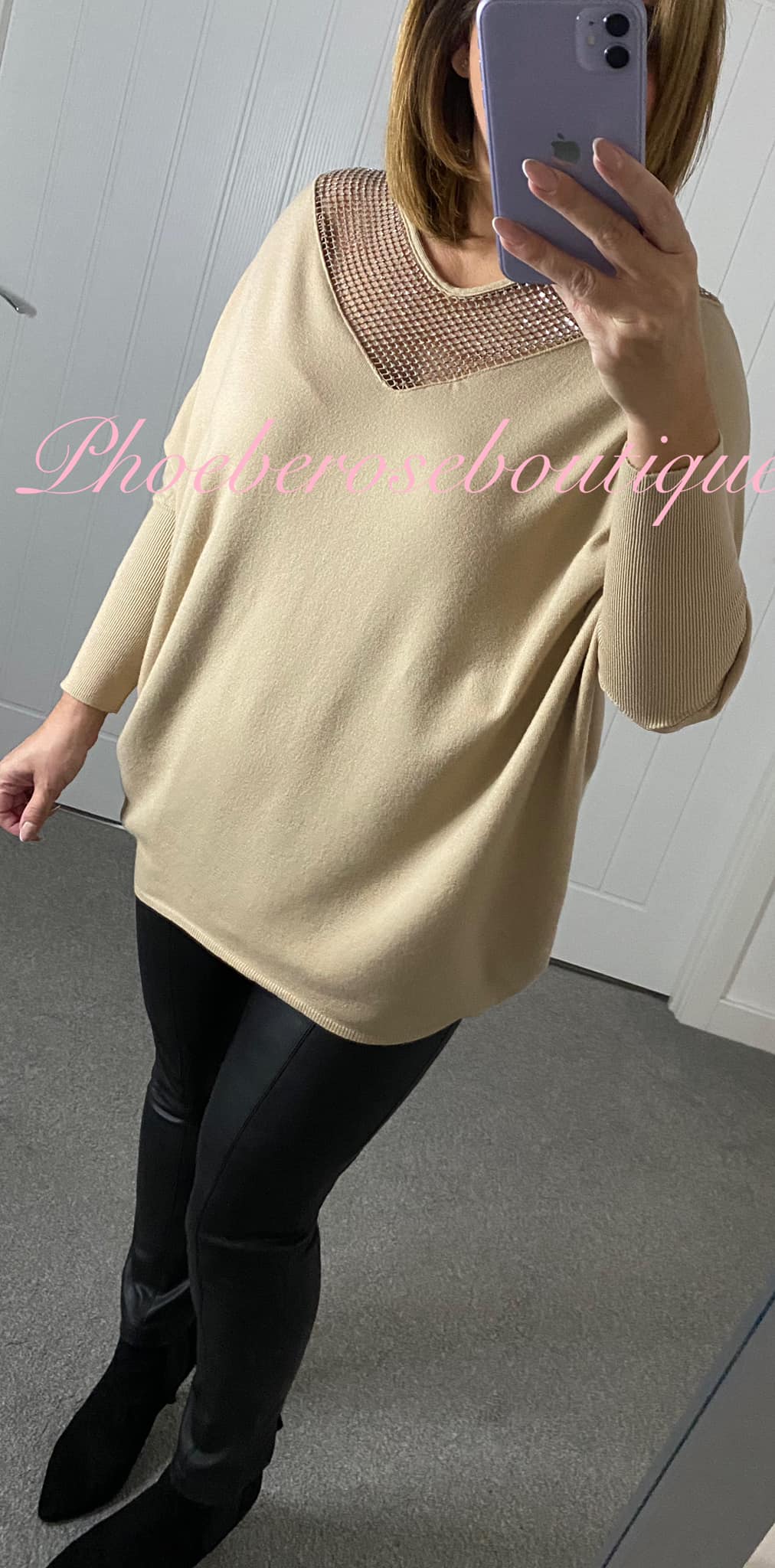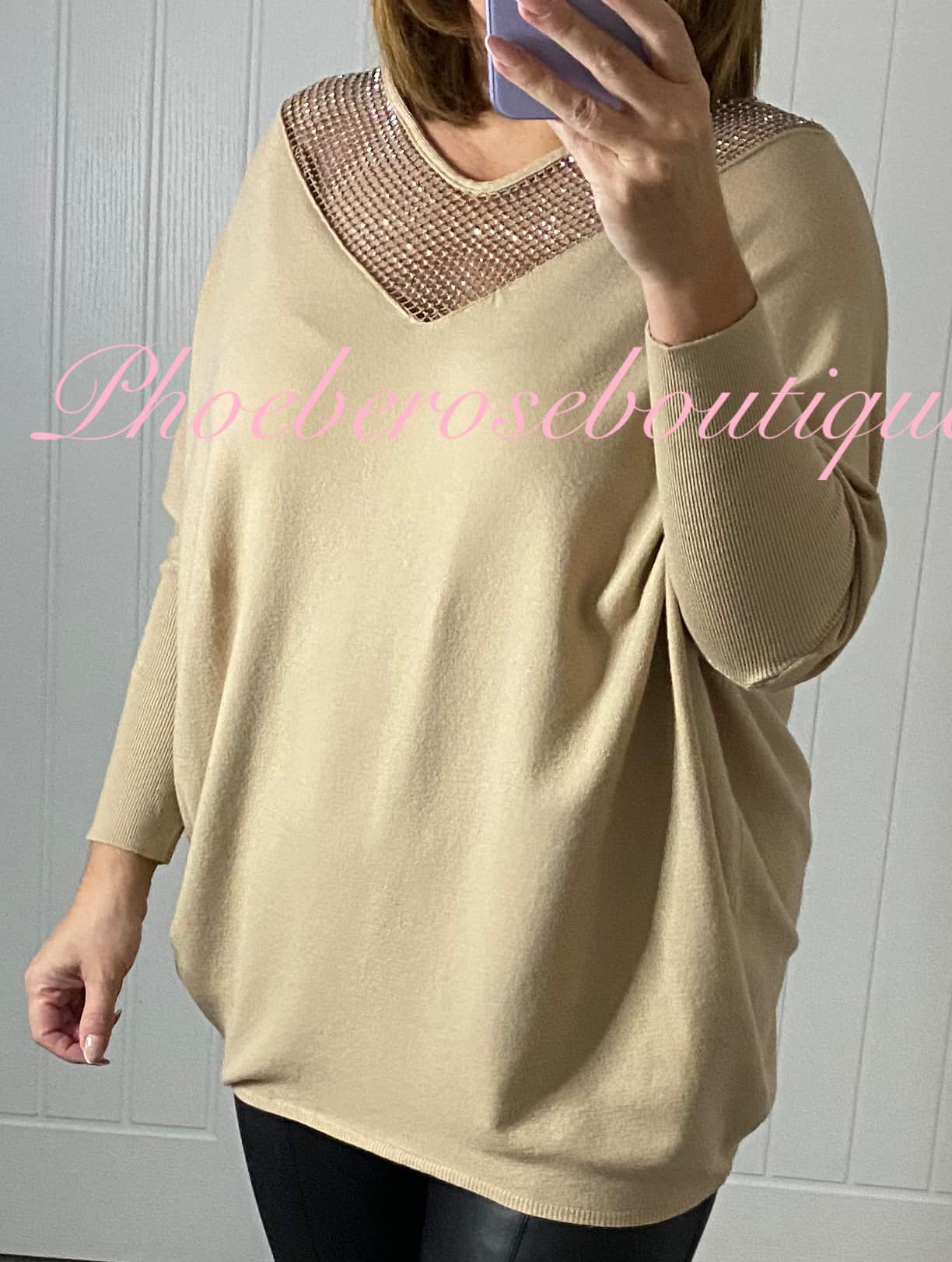 Be the first to review “Sparkle Mesh Neck Soft Knit Drape Jumper – Camel”
