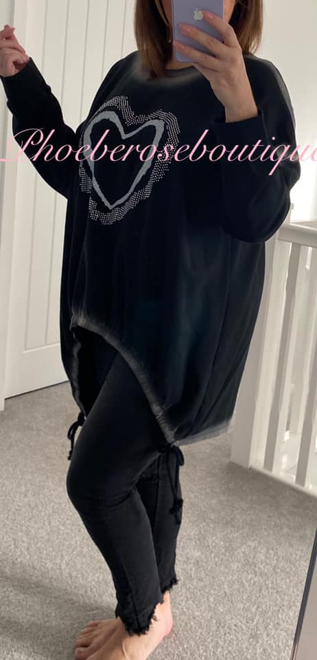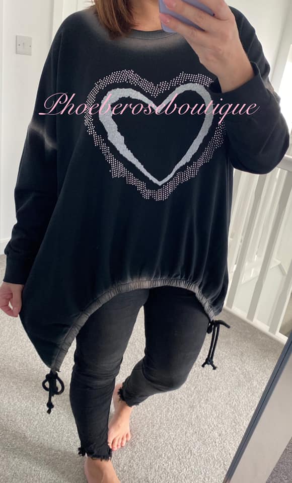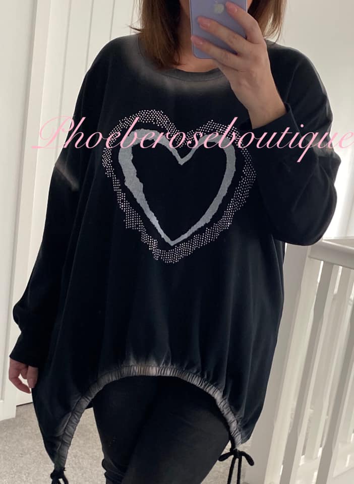 Sparkly Heart Hi/Low Soft Sweat Feel Draw Hem Top – Black