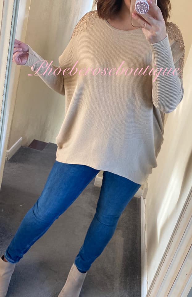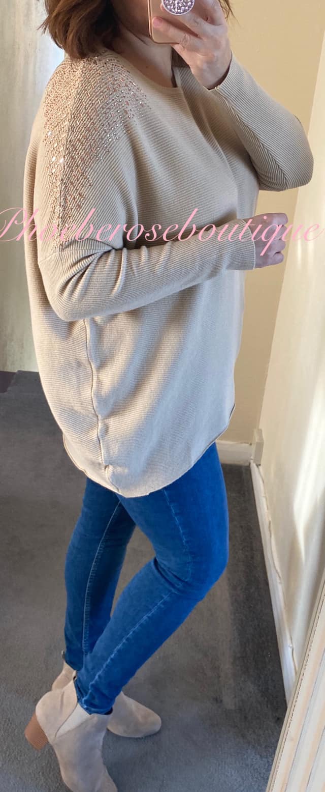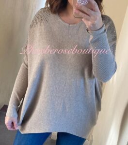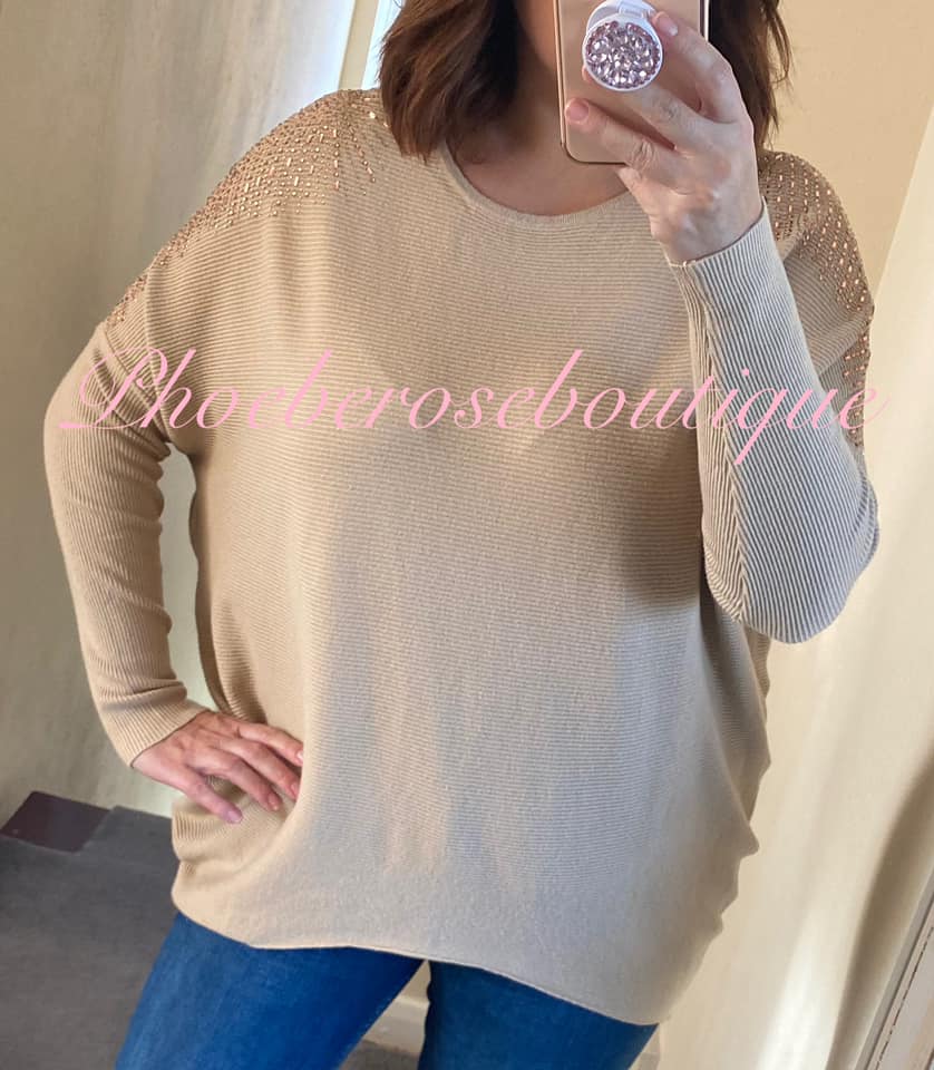 Sparkly Shoulder Embellished Soft Knit Rib Jumper – Camel/Rose Gold