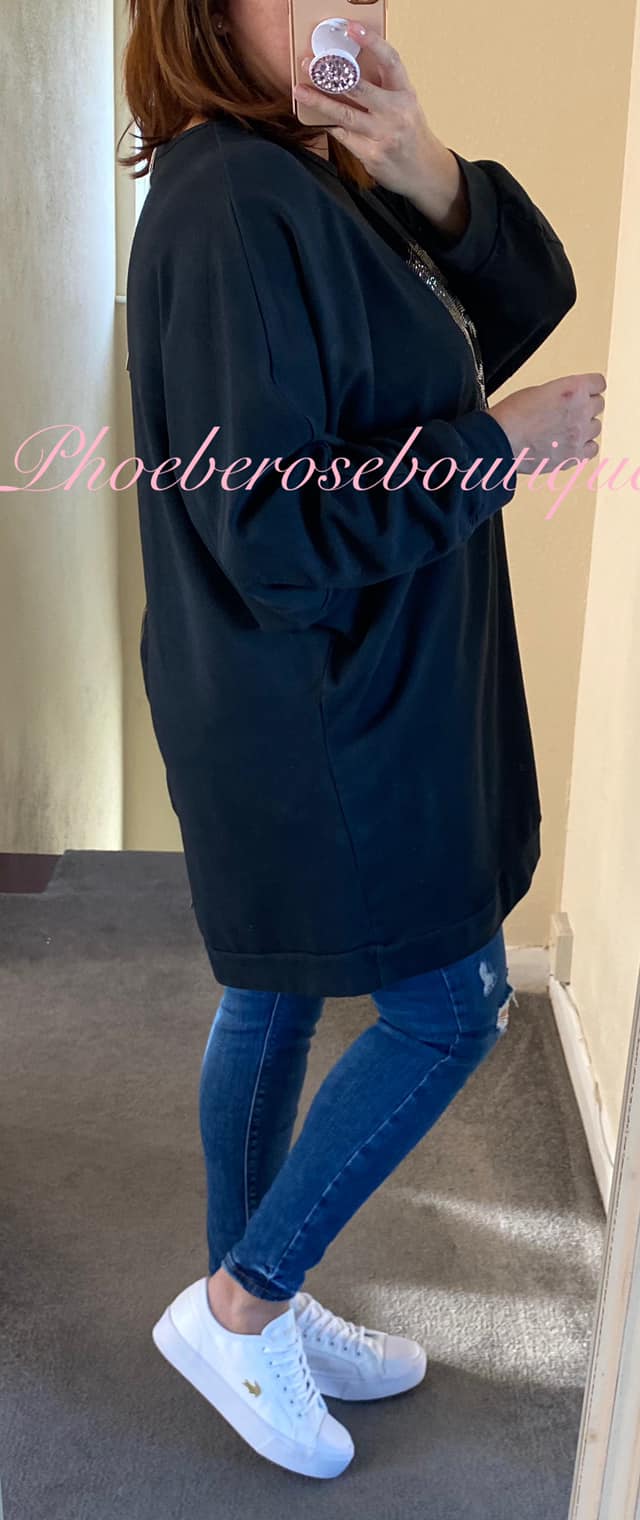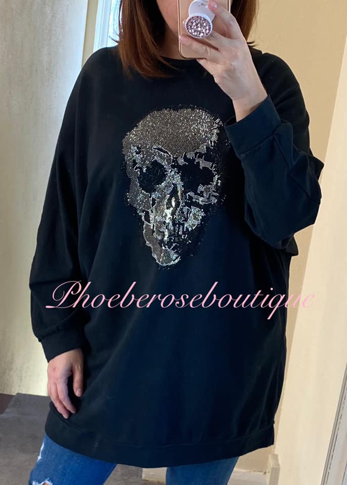 Sparkly Skull Embellished Sweat Zip Back Top – Black