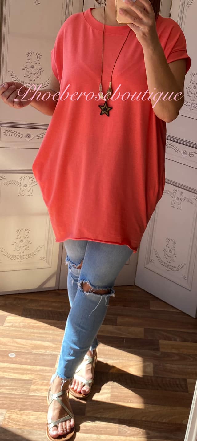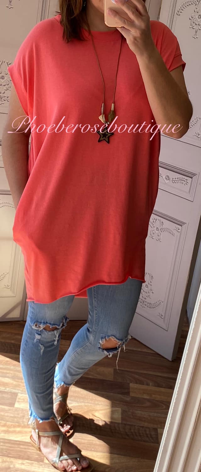 Stretch Jersey Cap Sleeve Pocket Necklace Tunic Top – Coral