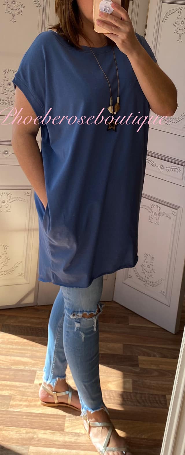 Stretch Jersey Cap Sleeve Pocket Necklace Tunic Top – Denim Blue