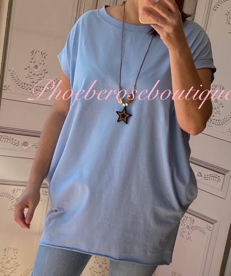 Be the first to review “Stretch Jersey Cap Sleeve Pocket Necklace Tunic Top – Soft Blue”