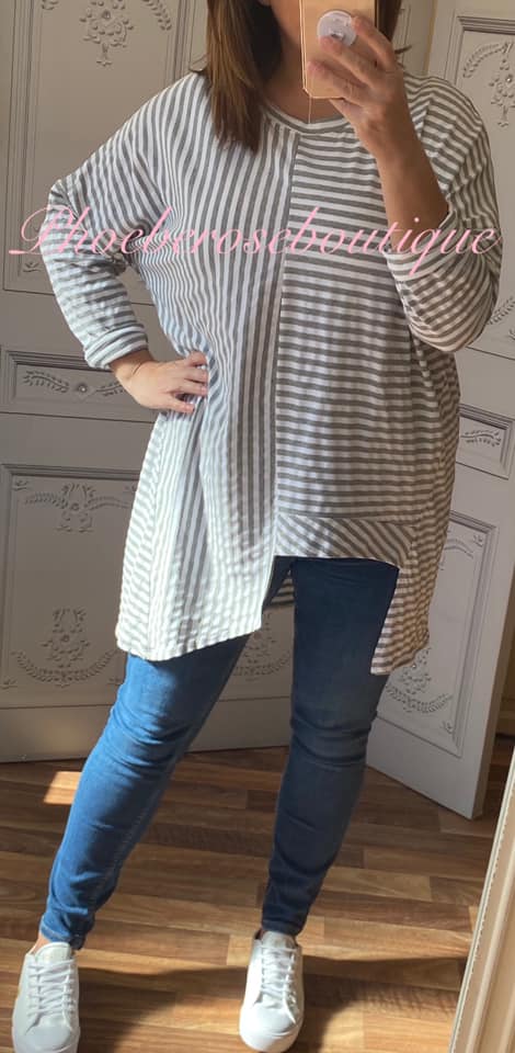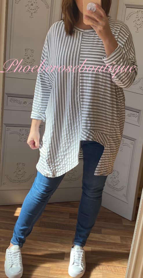Be the first to review “Asymmetric Striped Long Sleeve Jersey Top – Soft Grey”