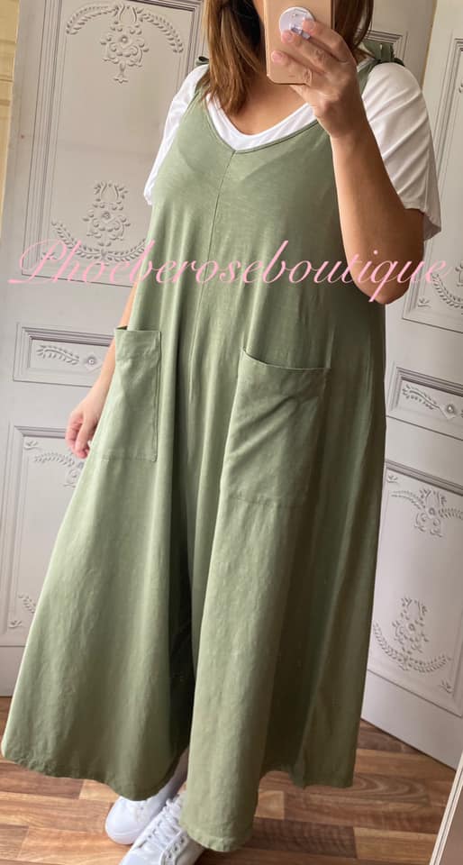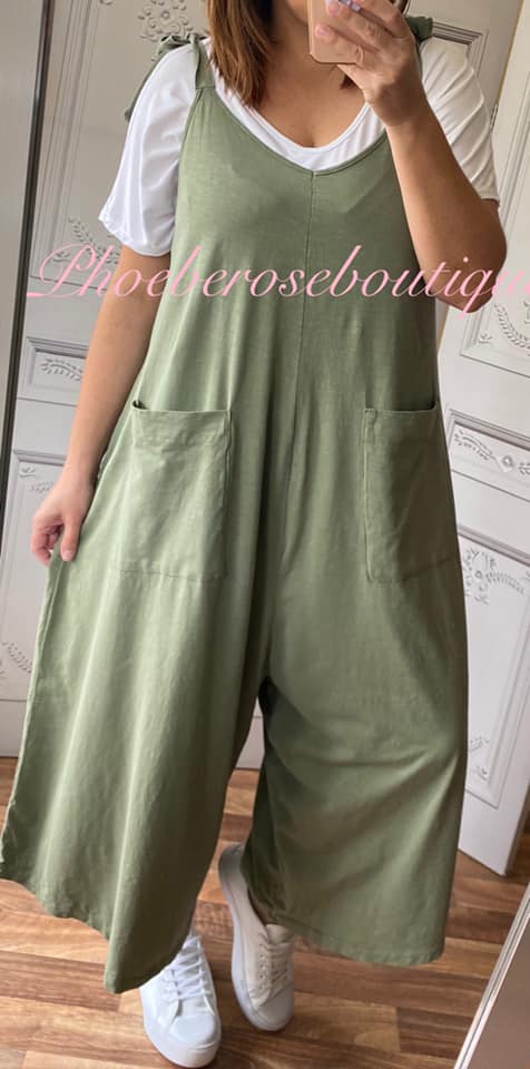 Tie Shoulder Loose Fit Pocket Midi Jumpsuit – Khaki