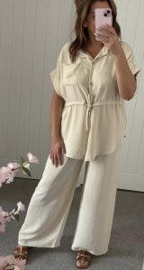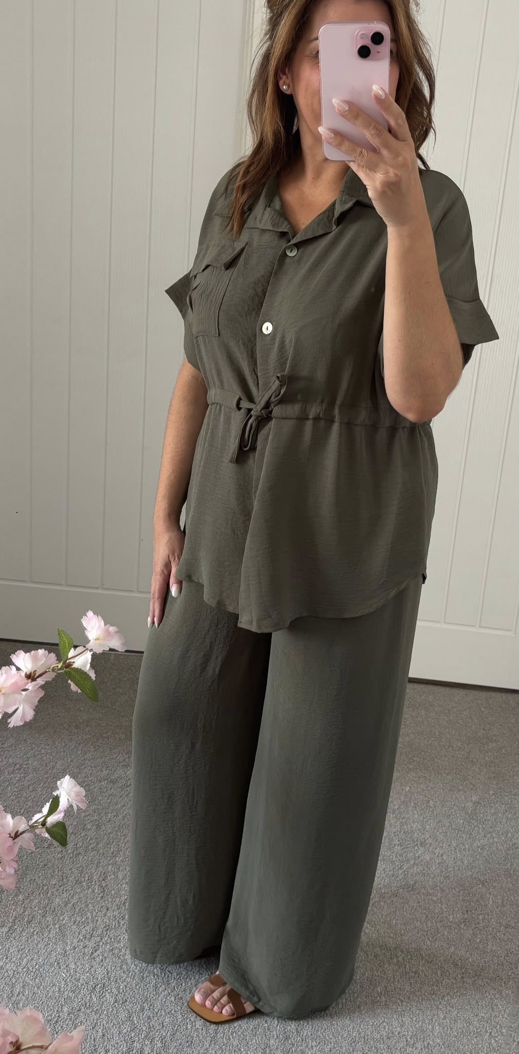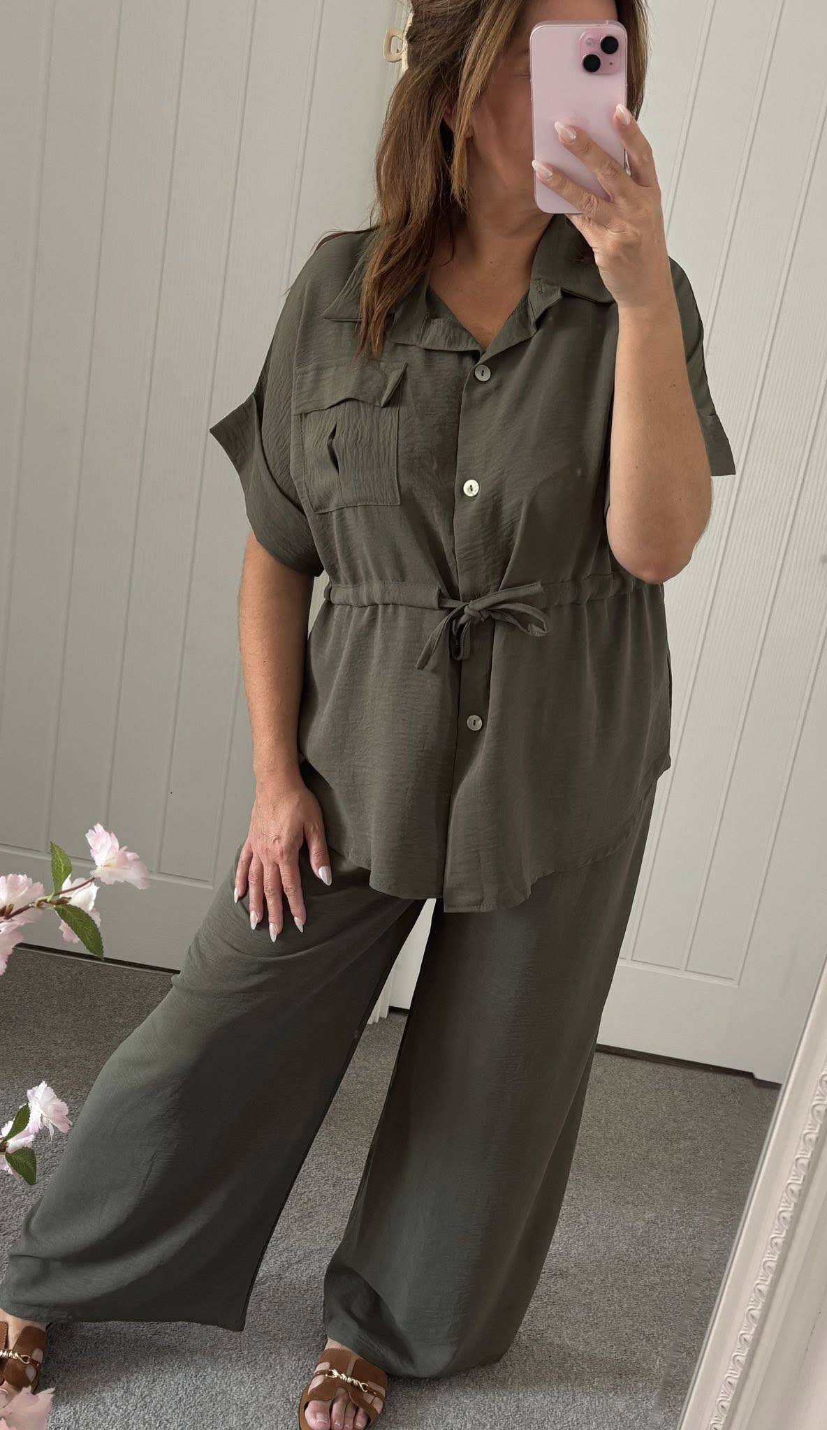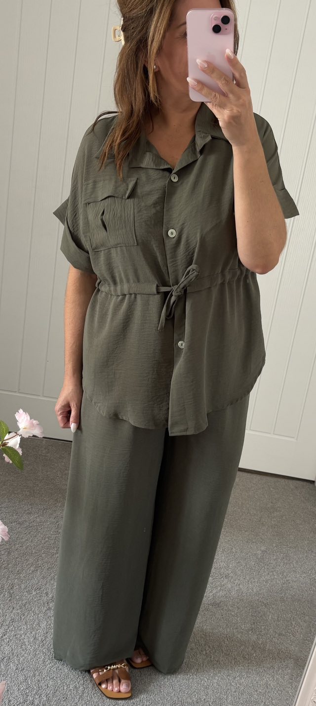 Gorgeous co-ord – Soft stretch crepe feel fabric, Tie waist longline shirt style top with elasticated waist pull on wide leg trousers – One size fits up to a good 16