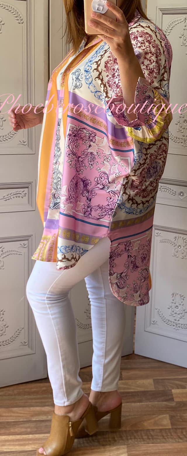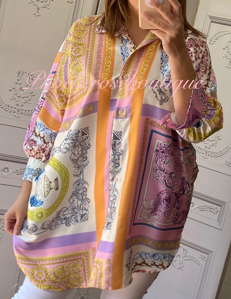 Tile Print Statement Satin Feel Oversized Shirt – Pink/Gold Mix