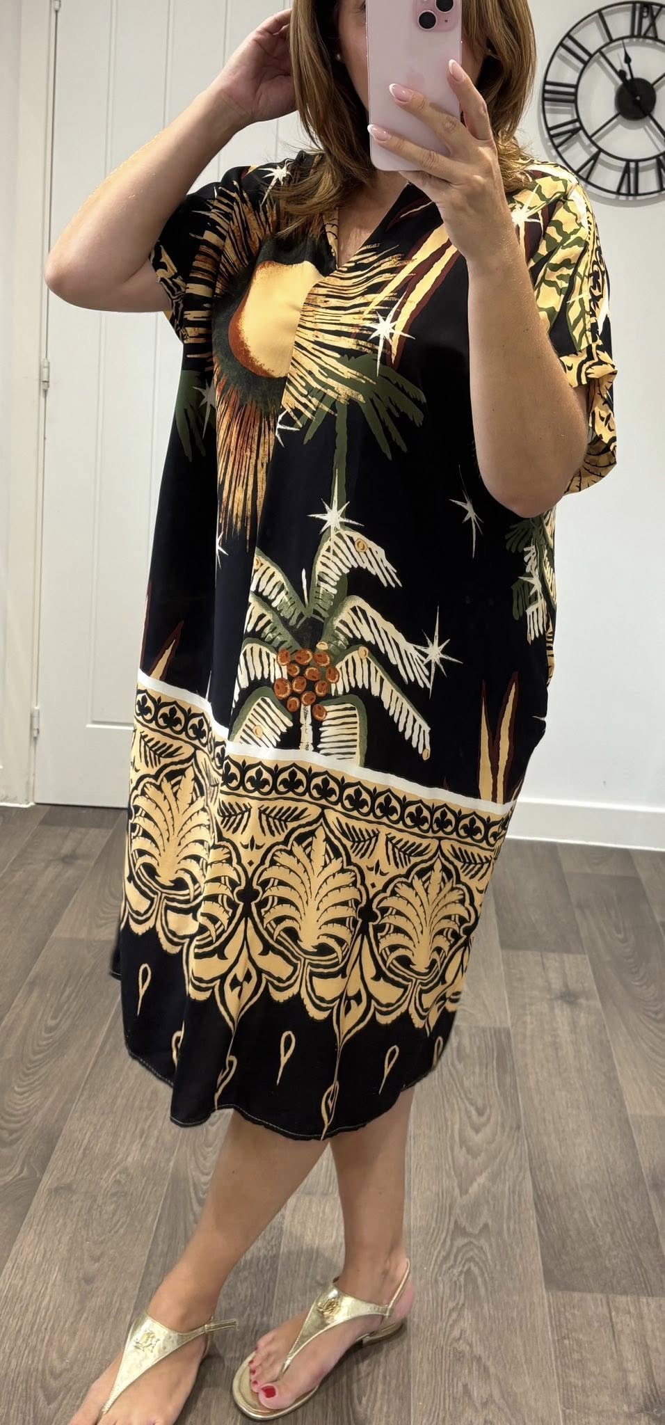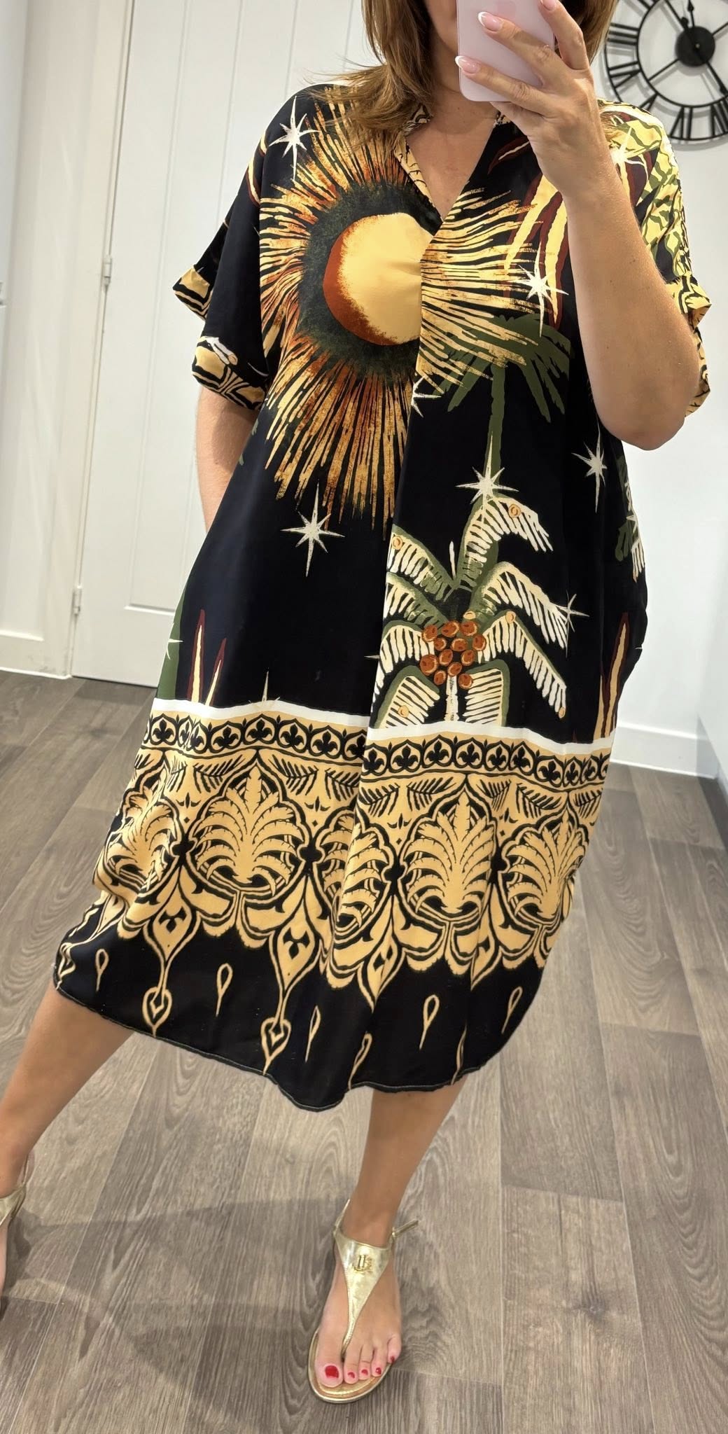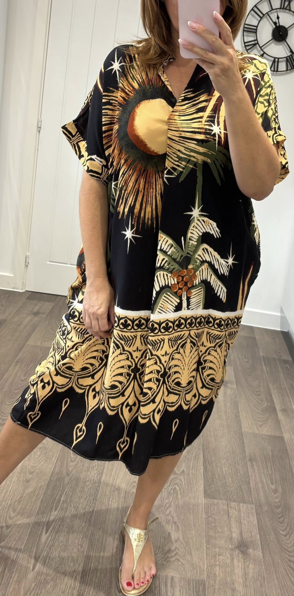 Lightweight cotton feel dress in a striking all over Summer nights print – Loose fit style with pockets – One size fits up to a 16