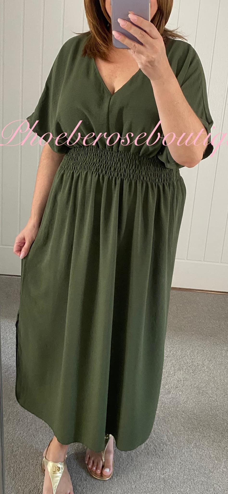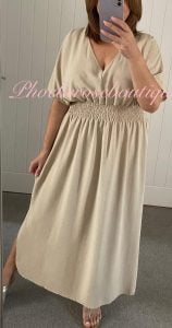 V Neck Elasticated Shirred waist Midi Dress – Khaki