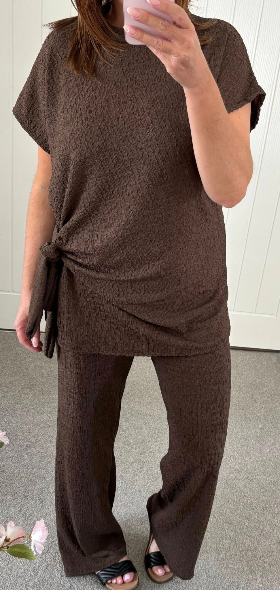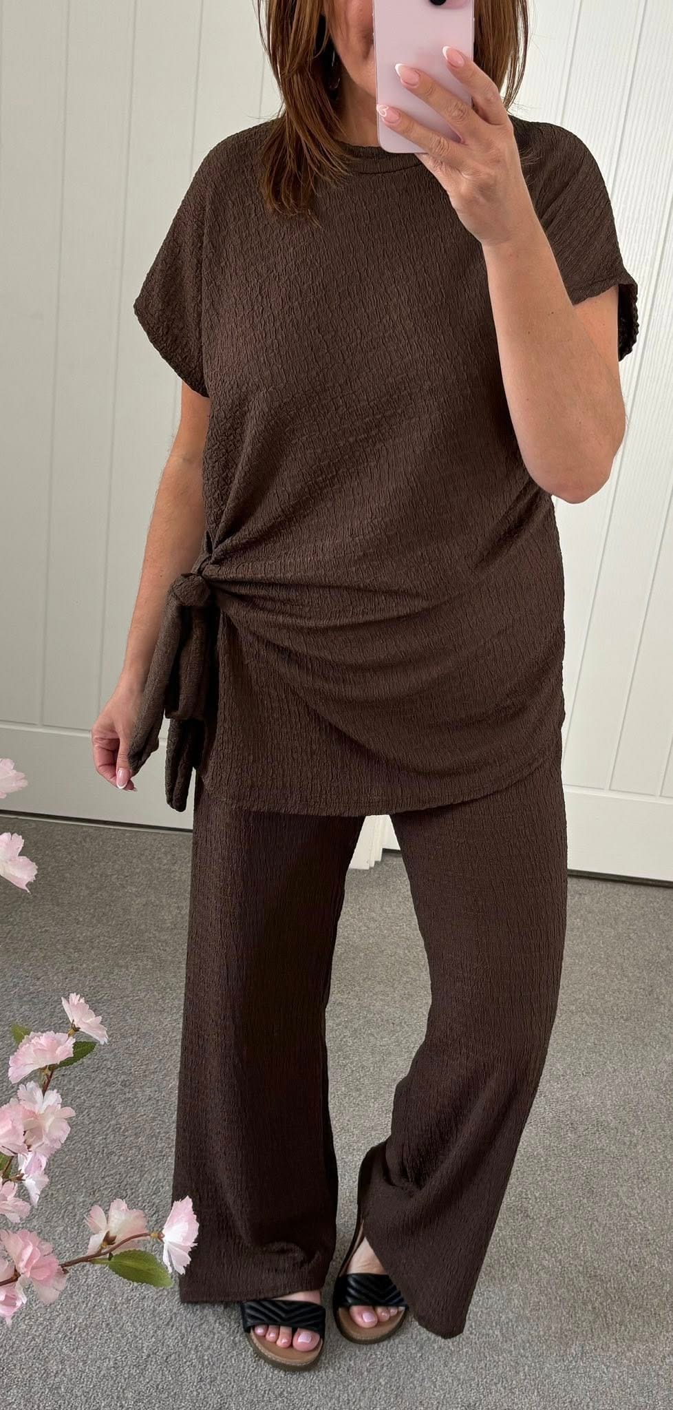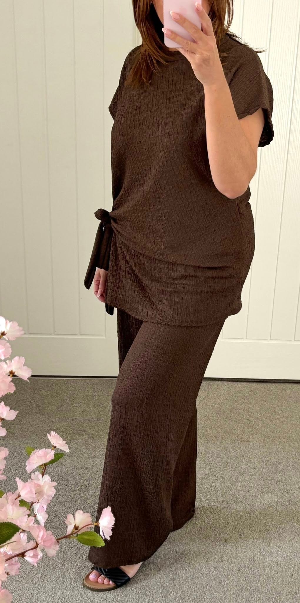Waffle Tie Side Wide Leg Suit – Brown