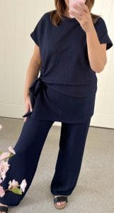 Stretch waffle effect fabric 2 piece suite – Wide leg pull on trousers with elasticated waistband – Loose fit tunic style top with flattering tie side – One size fits up to a 16